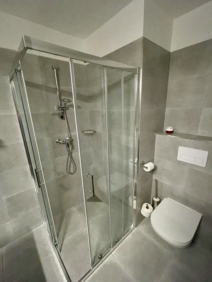 Koupelna je vybavena sprchovým koutem, toaletou a sušákem na ručníky.